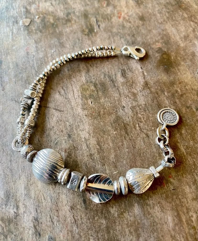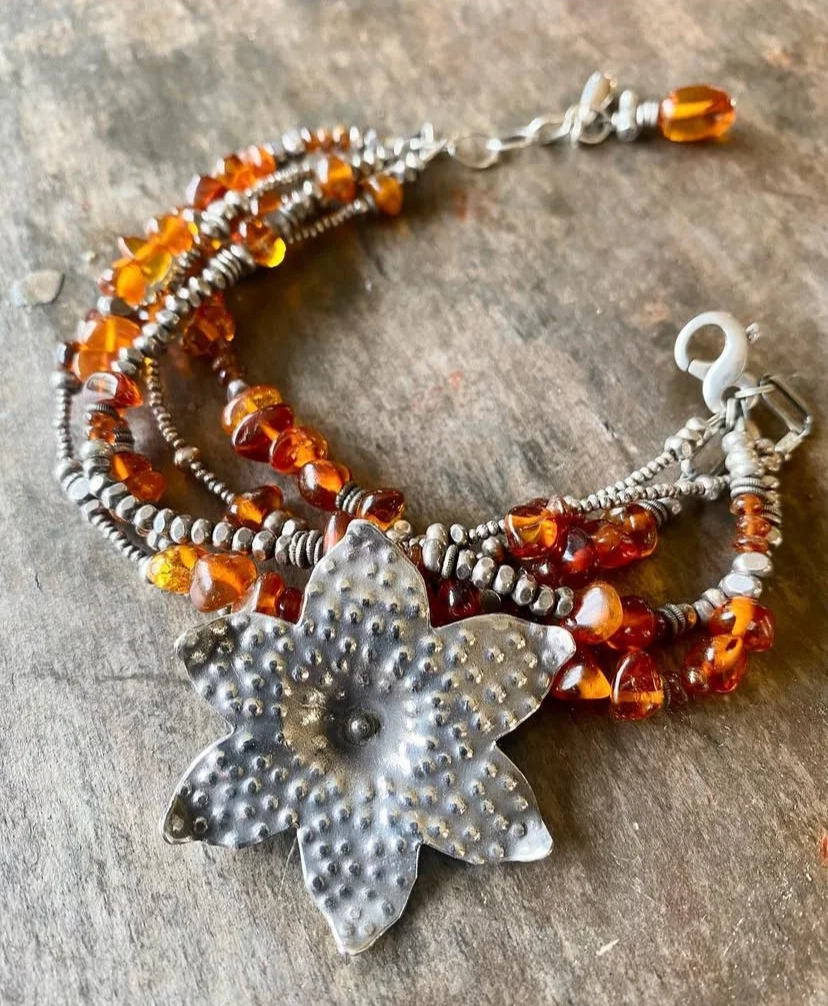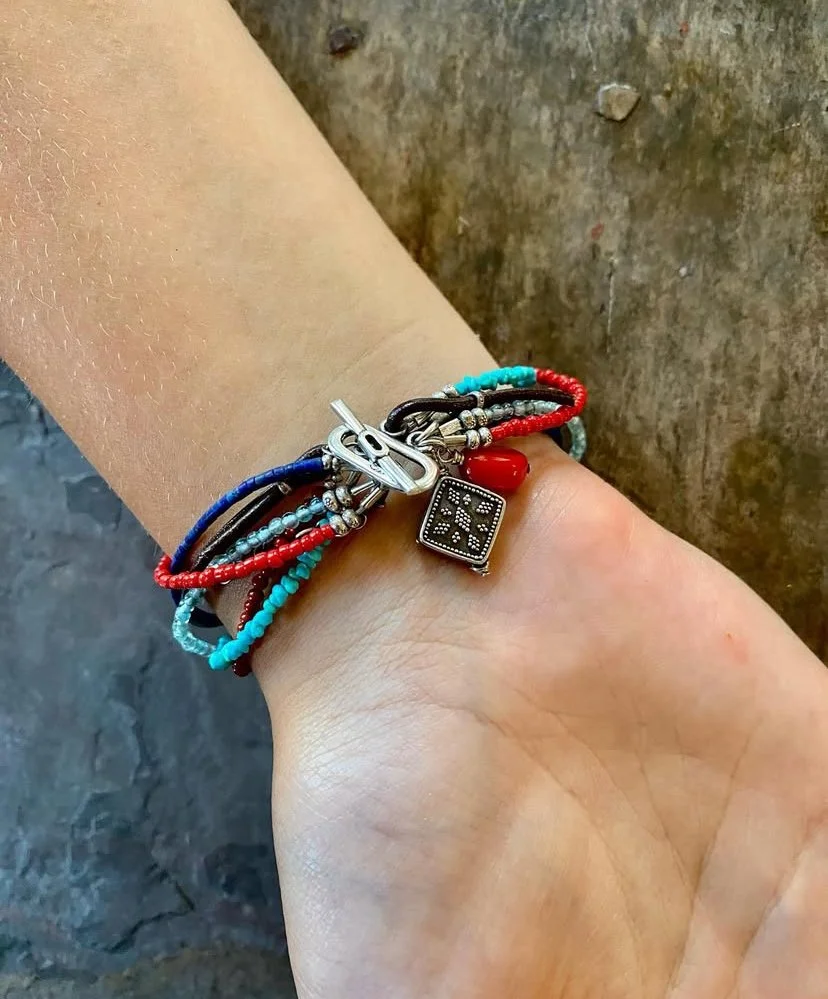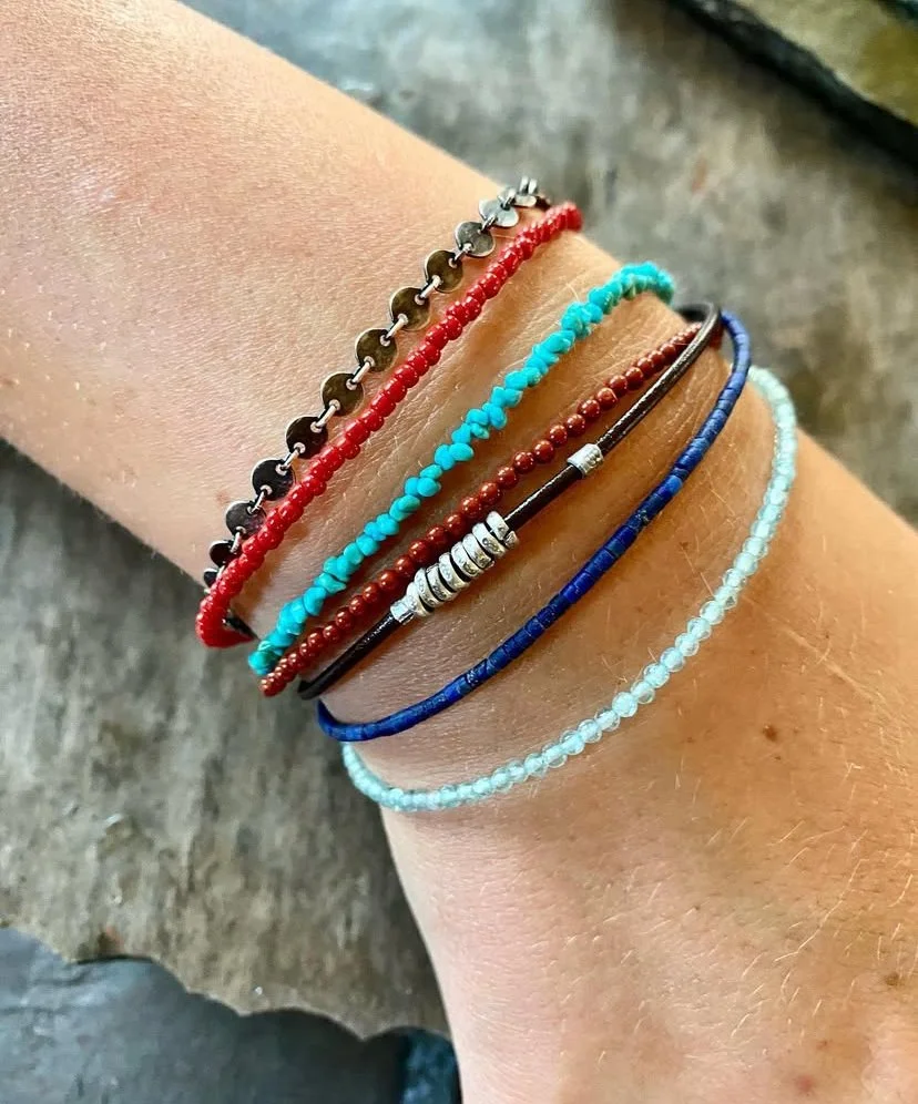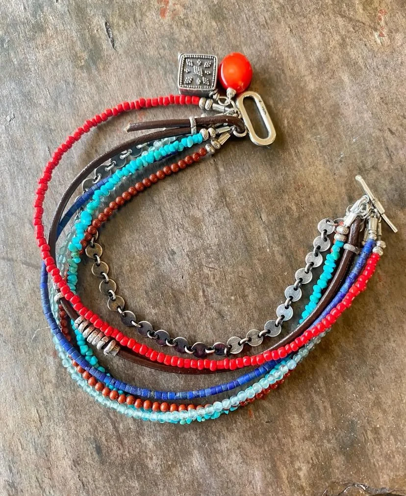 Original handmade bracelet, incorporating semi-precious gemstones of turquoise, lapis, jasper, red coral and aventurine, with sterling silver and leather accents $245