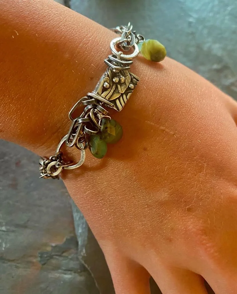 Sterling silver, pure silver, and the central handmade piece is kiln-fired fine silver. With three Peruvian opal gemstone drops $285