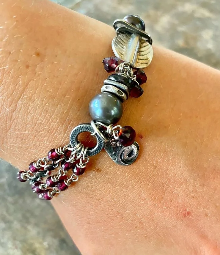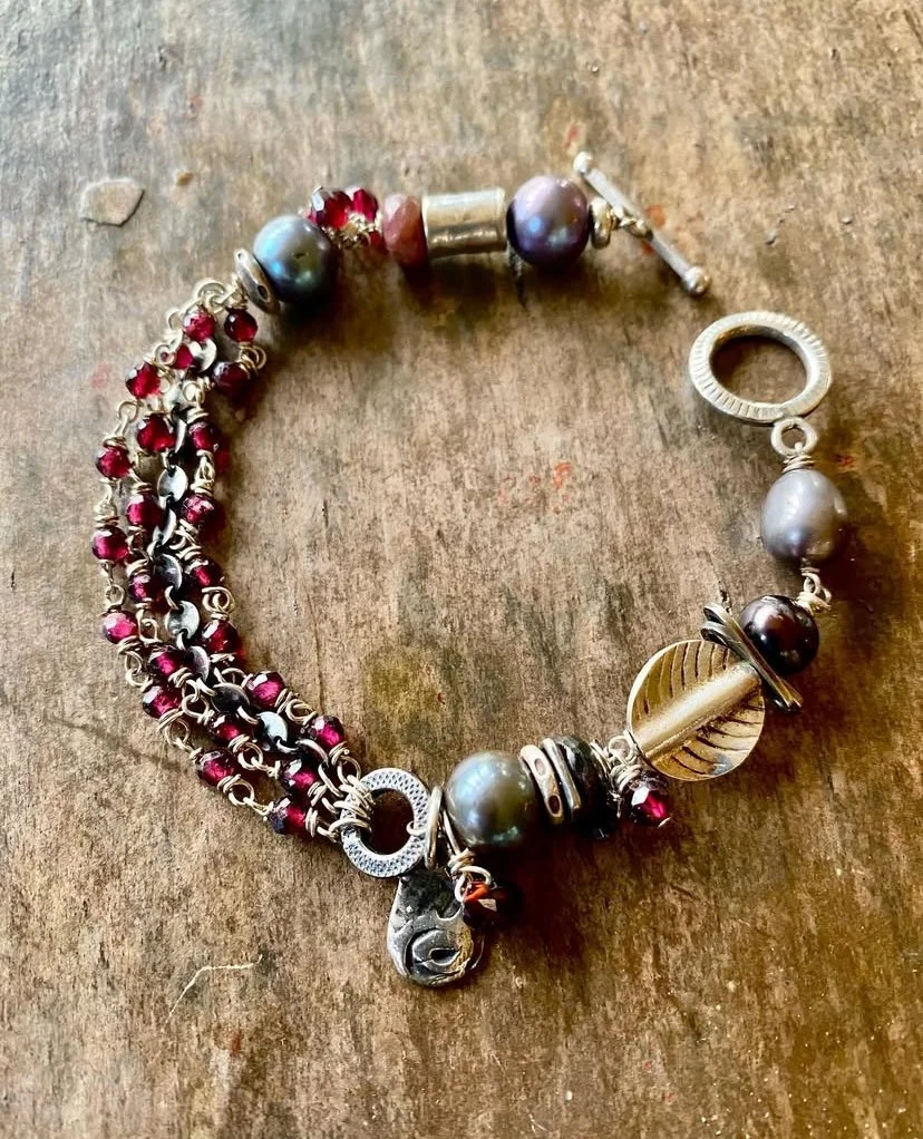 Bracelet in pure silver, garnets, and freshwater pearls $265