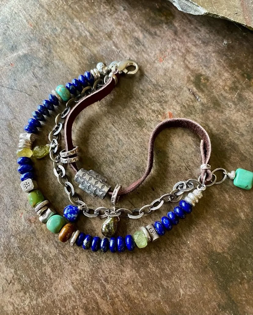 Triple strand bracelet in lapis, turquoise, jasper, green garnets, sterling silver, leather $225