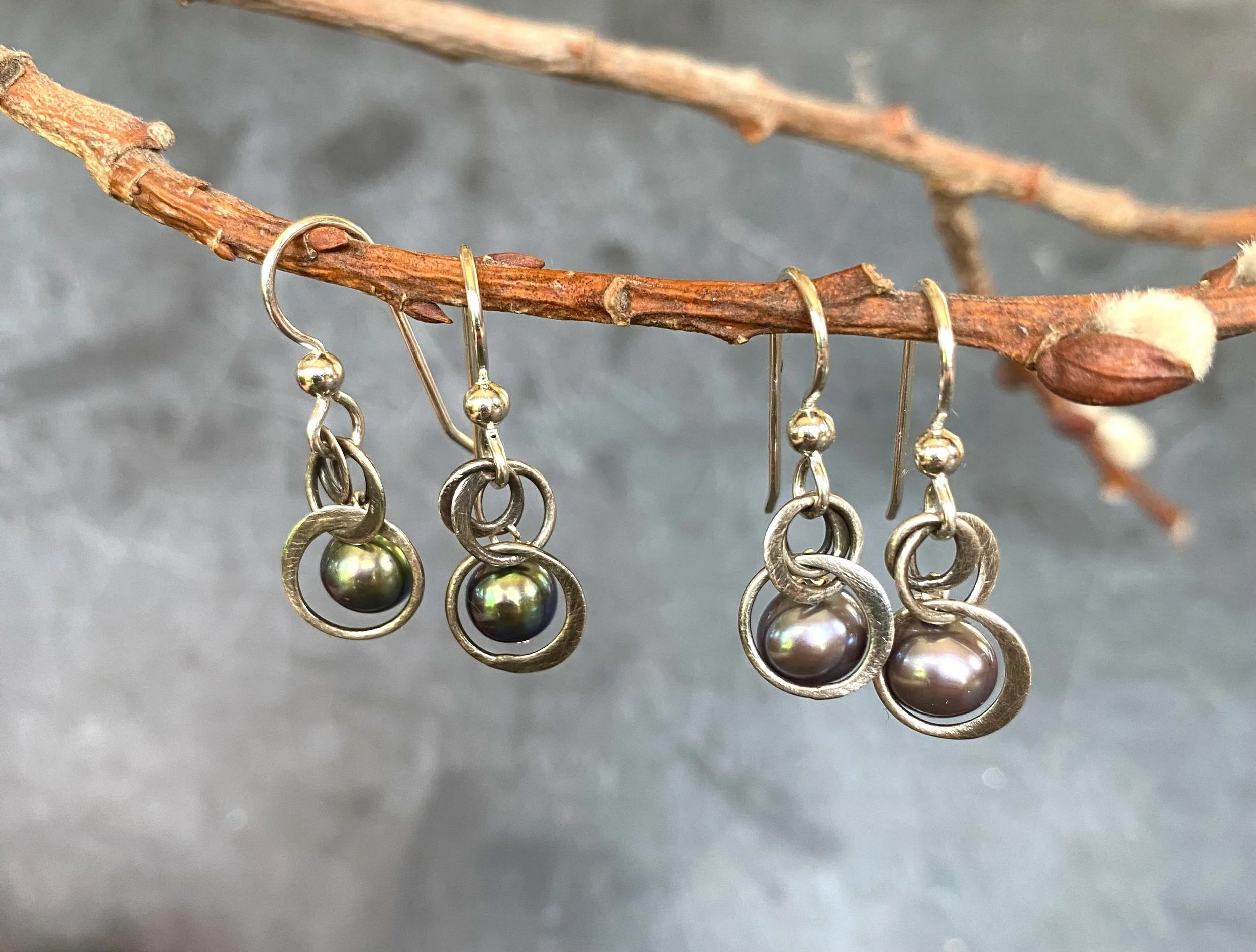Amber, freshwater pearl, and sterling silver. If you look closely into the amber, you will see flakes of insect and sediment $68
