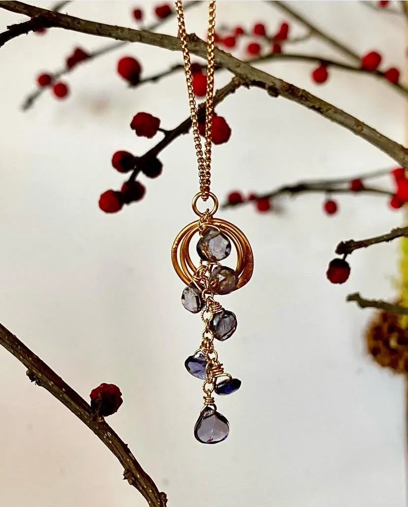 24k gold vermeil loops, 18k gold-filled chain, blue iolite teardrops $160