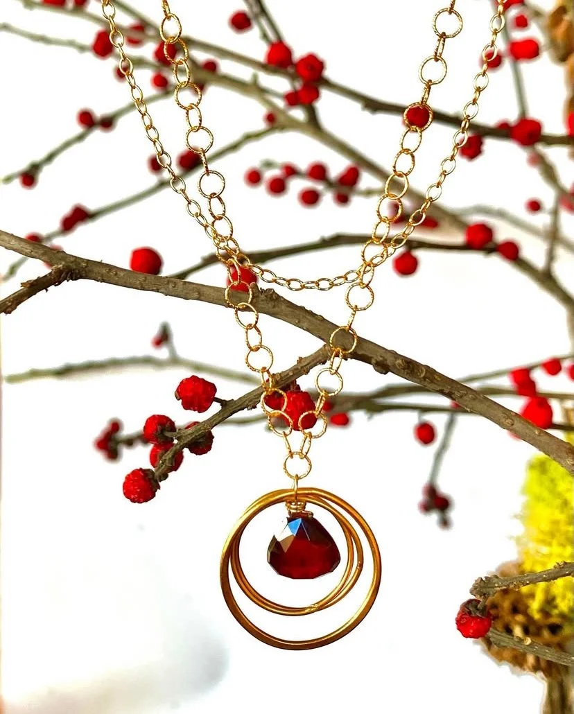 24k gold vermeil loops, 18k gold-filled double chain, garnet teardrop $128