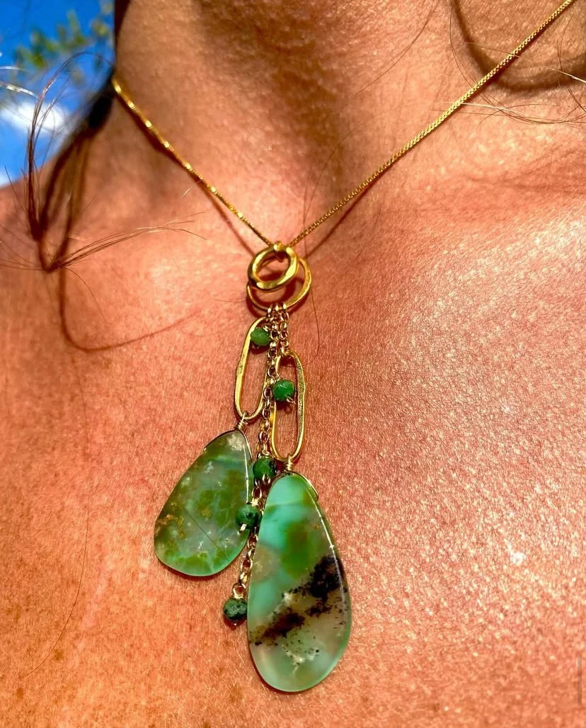 Green Chrysoprase is the star of this necklace, with mini faceted ruby zoisite dangling from 18 karat gold filled chain. The gold loops are made of 24 karat gold Vermeil and the adjustable chain is 18 karat gold filled $225