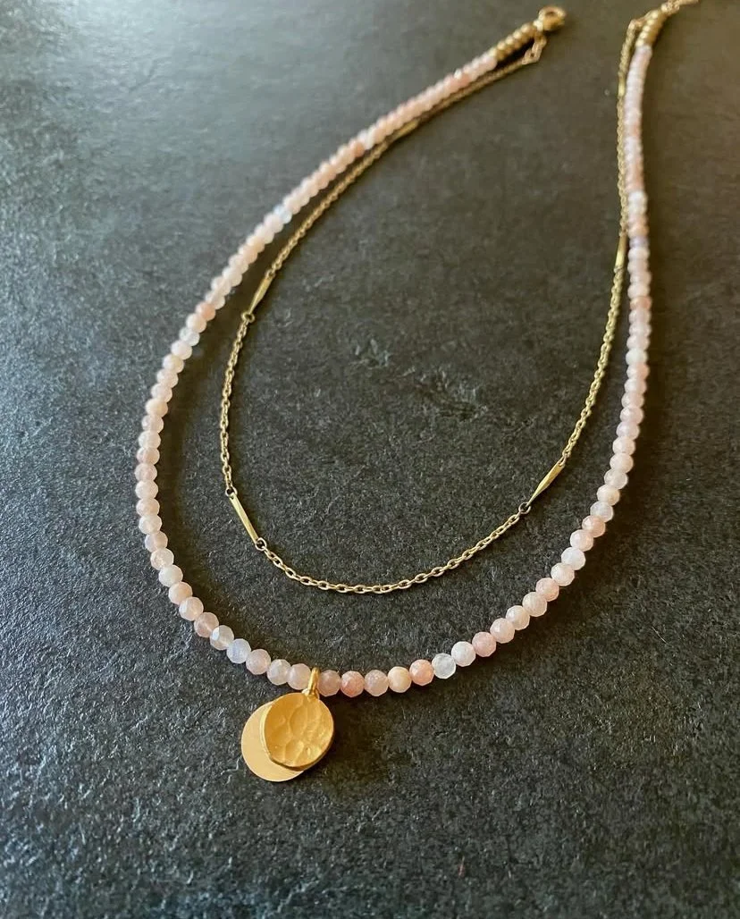 A double-strand necklace with stones in faceted rose quartz, the gold chain is made of brass, and the gold charms are 24k gold vermeil $168