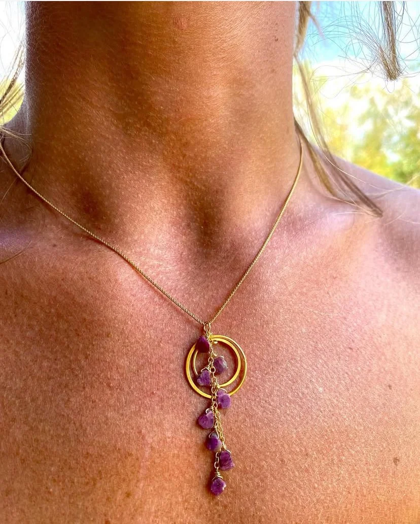 Rhodolite gemstones dangle from 2 loops of 24K gold vermeil with 18K gold-filled chain available in 16 or 18 in. $168